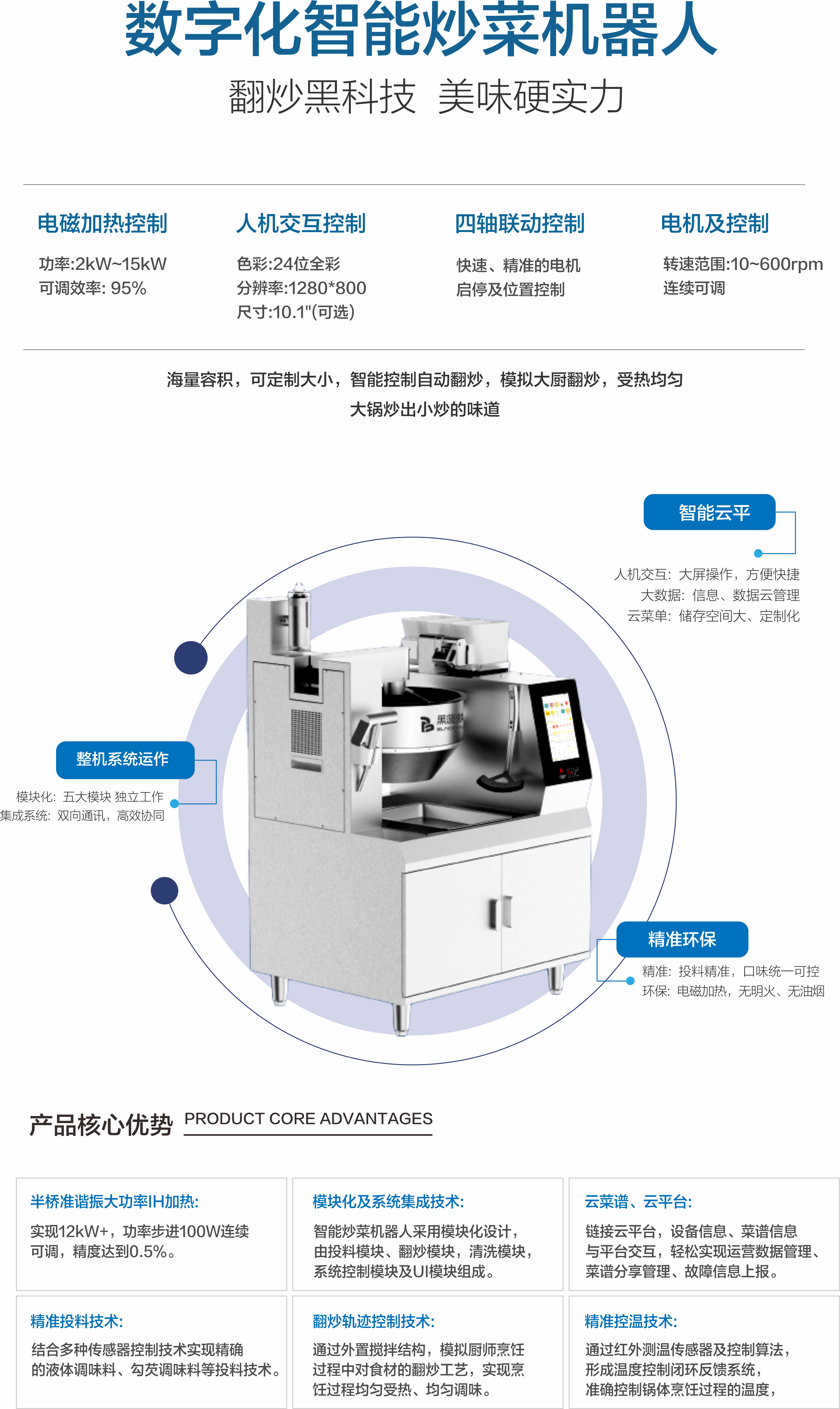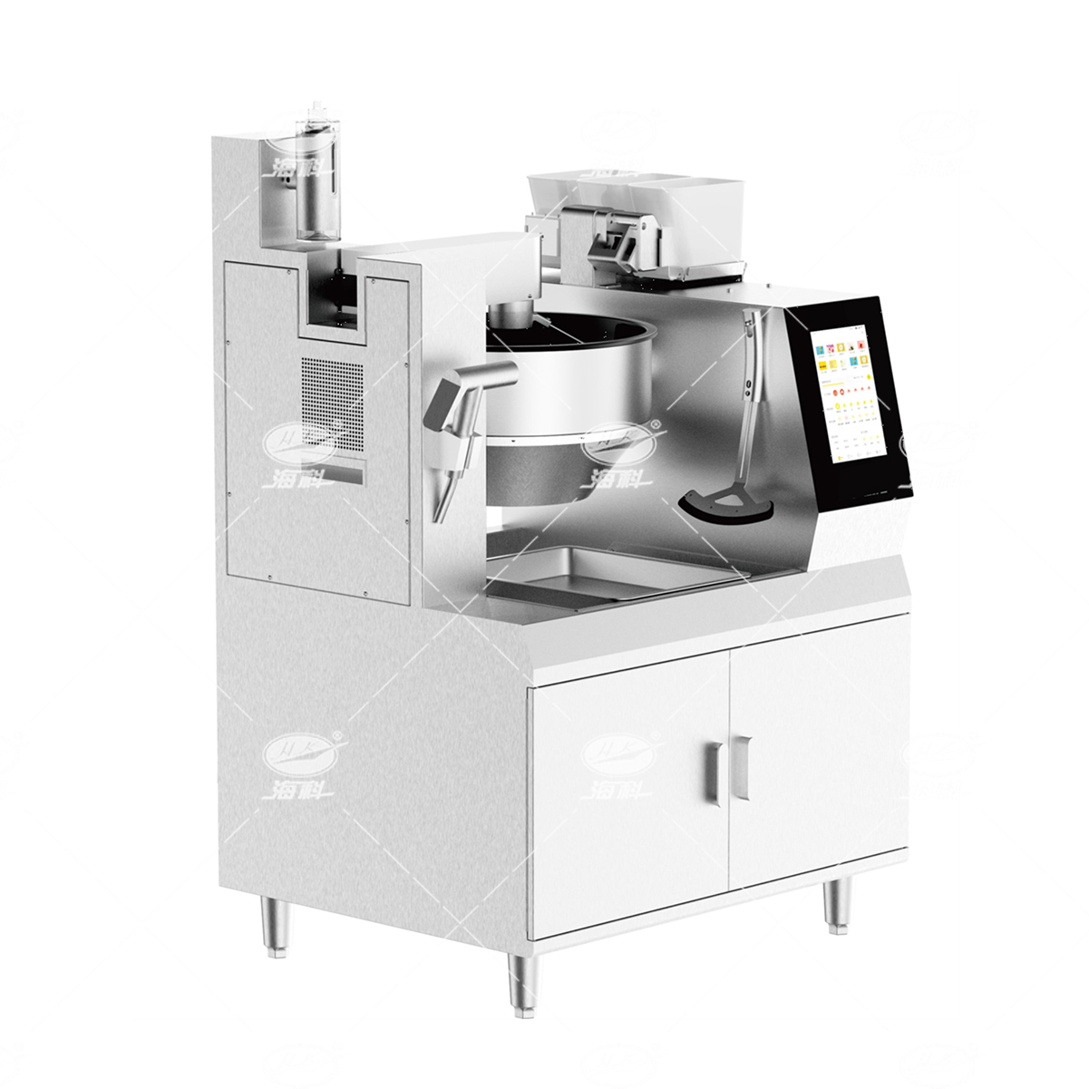 數(shù)字化智能炒菜鍋則根據(jù)指令按菜品工藝執(zhí)行炒制、按配方進行調(diào)味,機器手執(zhí)行抓取凈菜/調(diào)理肉/調(diào)料等動作,各模塊協(xié)同運作,全面保障烹飪、調(diào)料、出餐持續(xù)穩(wěn)定流暢進行。同時,小炒系統(tǒng)配置自動清洗功能,菜品炒制結(jié)束任務(wù)結(jié)束后,自動進行清洗。