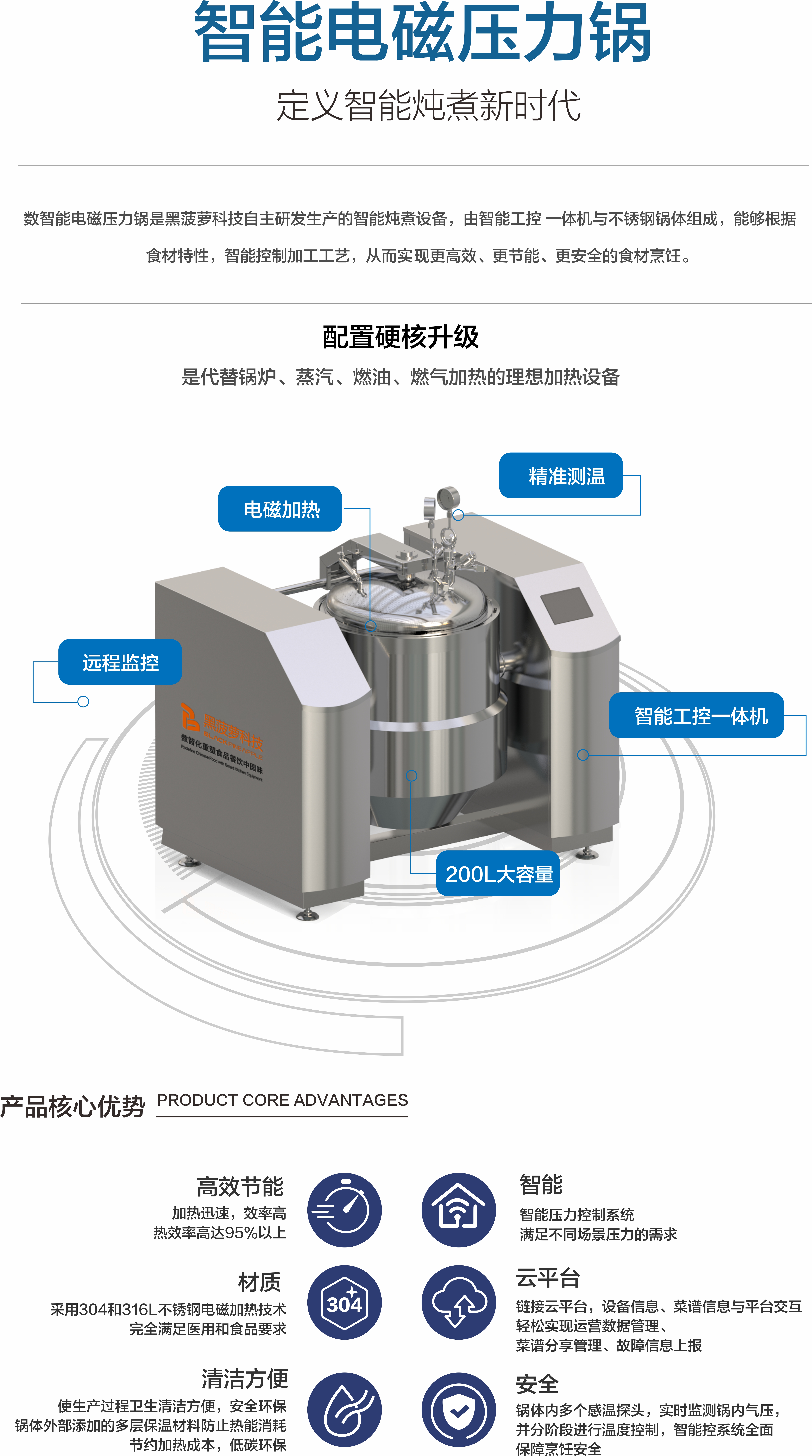 智能電磁壓力鍋采用最新的304不銹鋼電磁加熱技術(shù),集智能控溫、智能控壓、智能云配方、智能配料等功能于一體。適用于大型中央廚房、機關(guān)及企業(yè)食堂燉蒸煮、燉湯、熬粥、燒菜等多種加工需求。